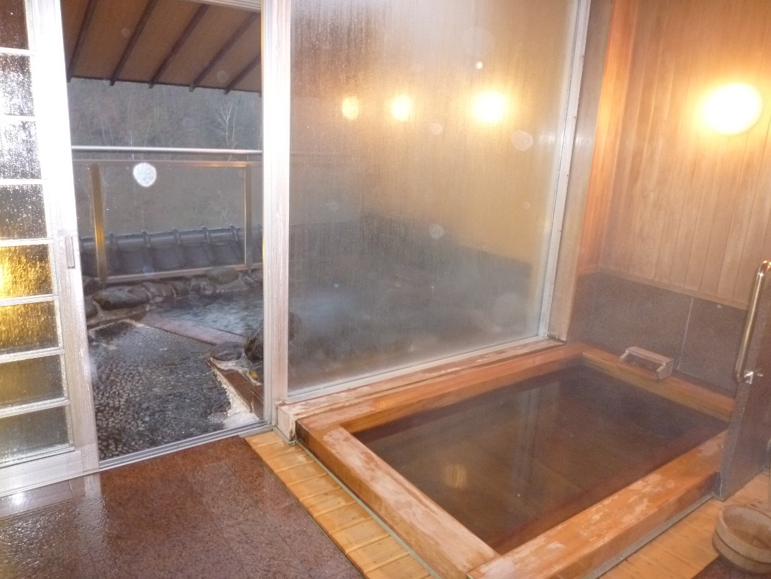 部屋は最上階の特別室で、和室10帖+洋間リビング+ツインベッドルーム、露天風呂(岩風呂)に内湯は檜風呂で、脱衣場はまるで大浴場のそれと同じような洗面台と鏡付き。