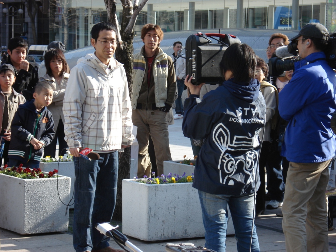 で、その人垣の中心には福永俊介アナとお天気お姉さん、その他スタッフが生中継の準備をしていて、生中継の製作現場ってこんな風なんだと感心して見てました。ついでに、写真も撮ってきました。一応、道内では有名人なんで(^^ゞ